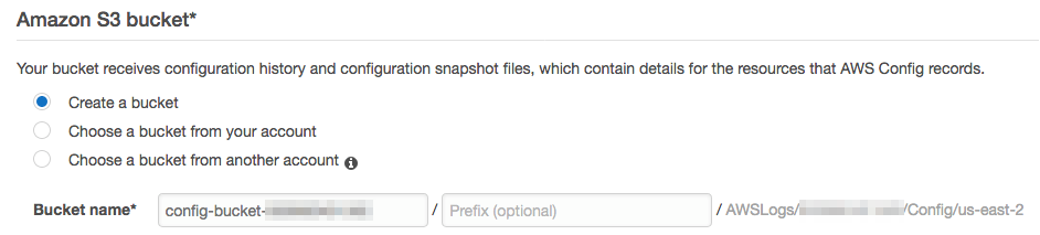 - 选择用于存储配置历史记录和快照的 Amazon S3 存储桶。我们会创建一个新的 Amazon S3 存储桶。