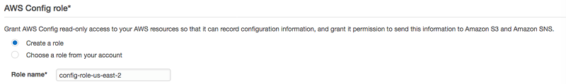 - 除非您已经有要使用的角色,否则请在 AWS Config role (AWS Config 角色) 下选择 Create a role (创建角色)。我们使用系统自动推荐的角色名称。