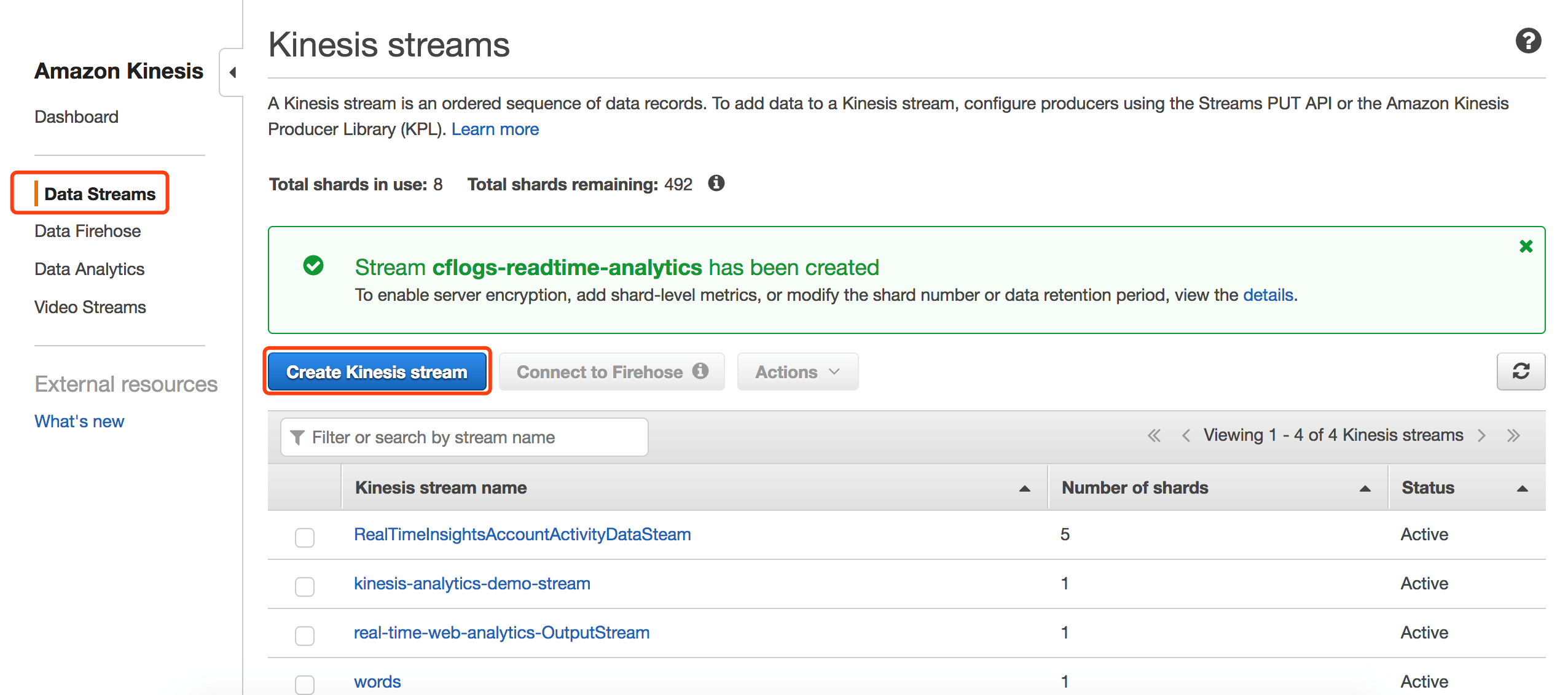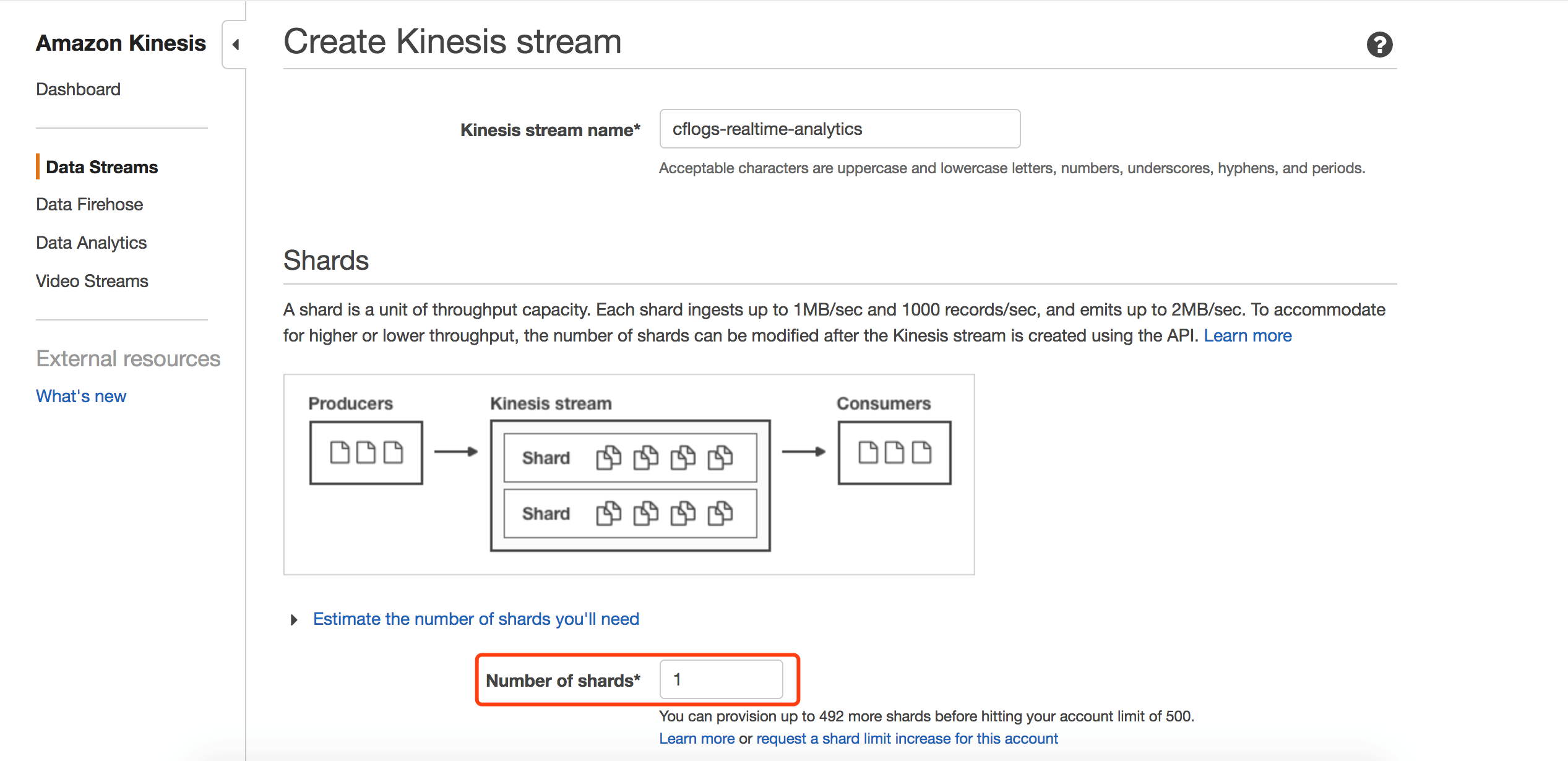 创建Kinesis Stream,用于接收Lambda发送过来的日志。