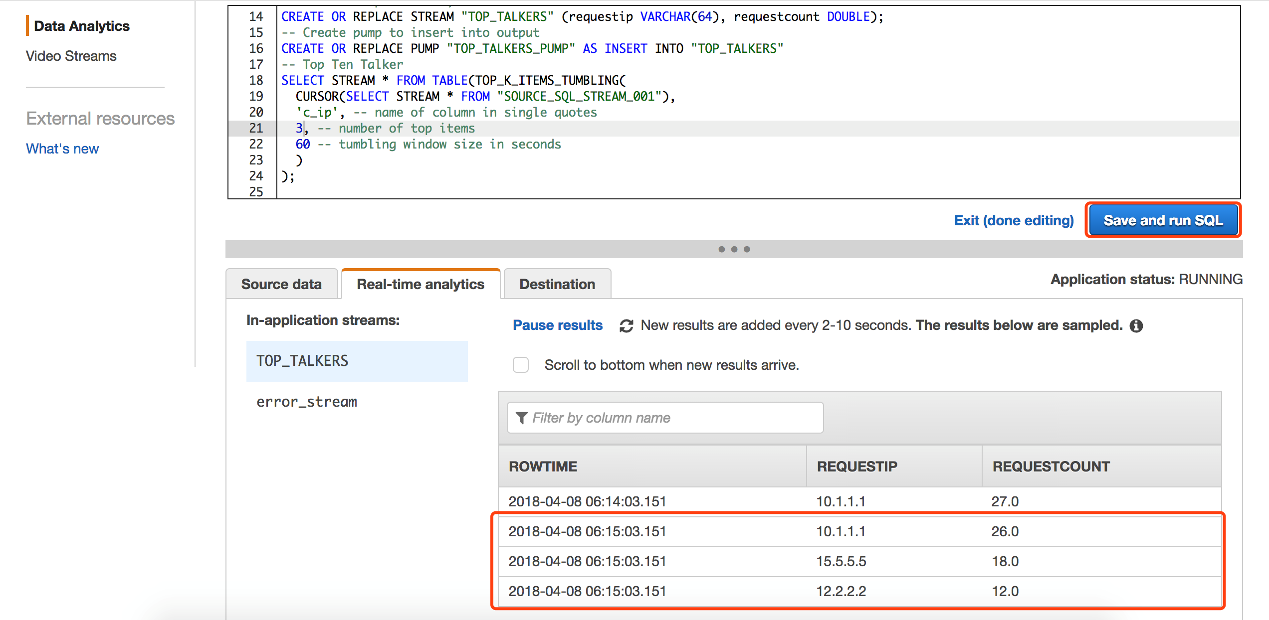 下面的SQL语句以1分钟为时间窗口,分析出1分钟内,访问CloudFront的Top3的用户ip地址,Kinesis Analytics的窗口可以实时观察到每分钟分析的结果,非常利于调试。