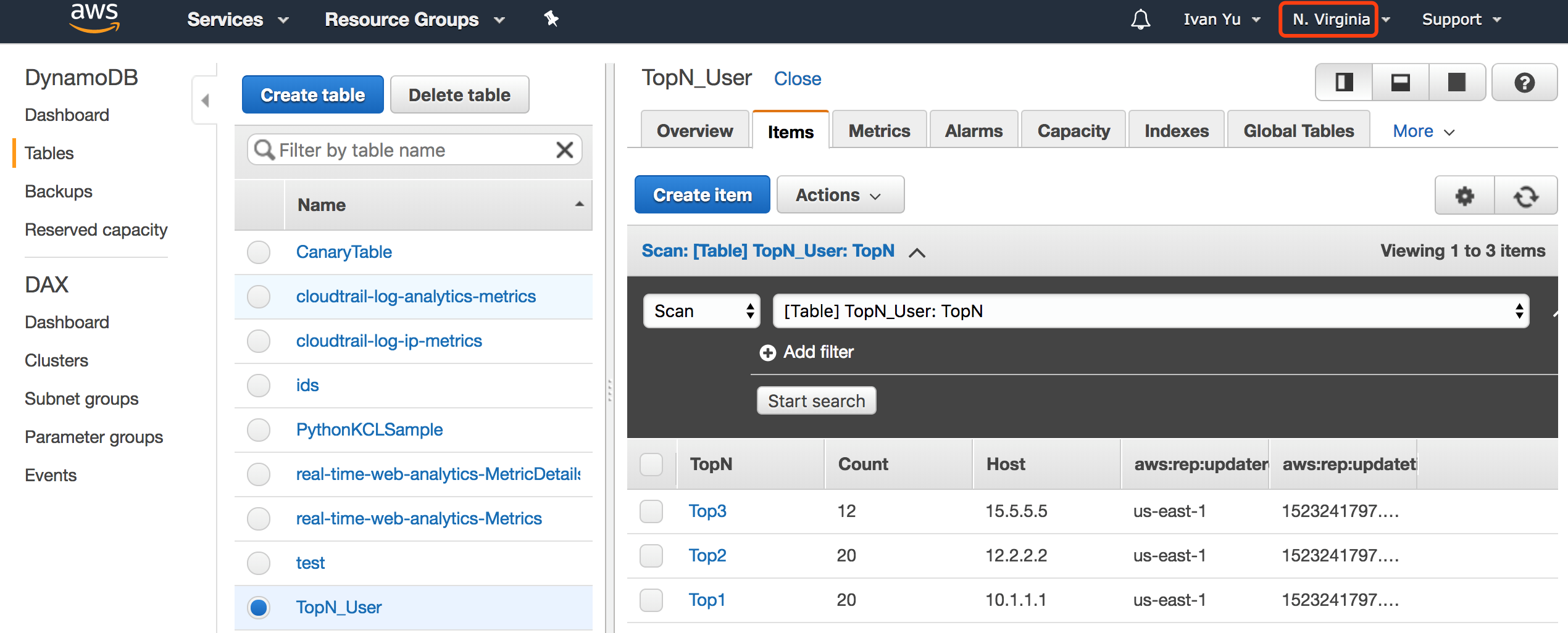 我们可以进入到DynamoDB中,查看之前创建的表,不断地刷新,查看表中数据的变化。