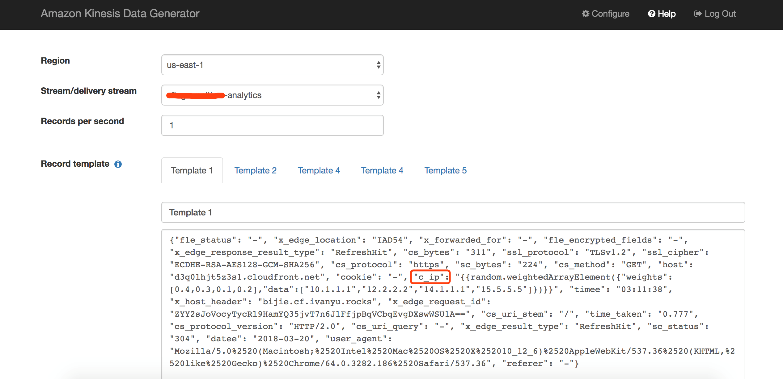 Kinesis Data Generator通过PC端浏览器的简单配置,就能够快速地产生测试流量打入指定的Kinesis流中,并且支持产生一定随机的数据,下图中,我们将数据以每秒一条的速度打入us-east-1区域的Kinesis流,数据的格式模拟Lambda函数的输出,即:以JSON格式输出CloudFront日志的每个字段,并且c_ip客户端ip字段通过简单的设置,让工具以一定的比例生成4个ip地址中的一个,其他字段都为固定字段,测试数据可以通过让CloudFront产生日志后,在Lambda函数中输出获得,或者从如下链接获取: