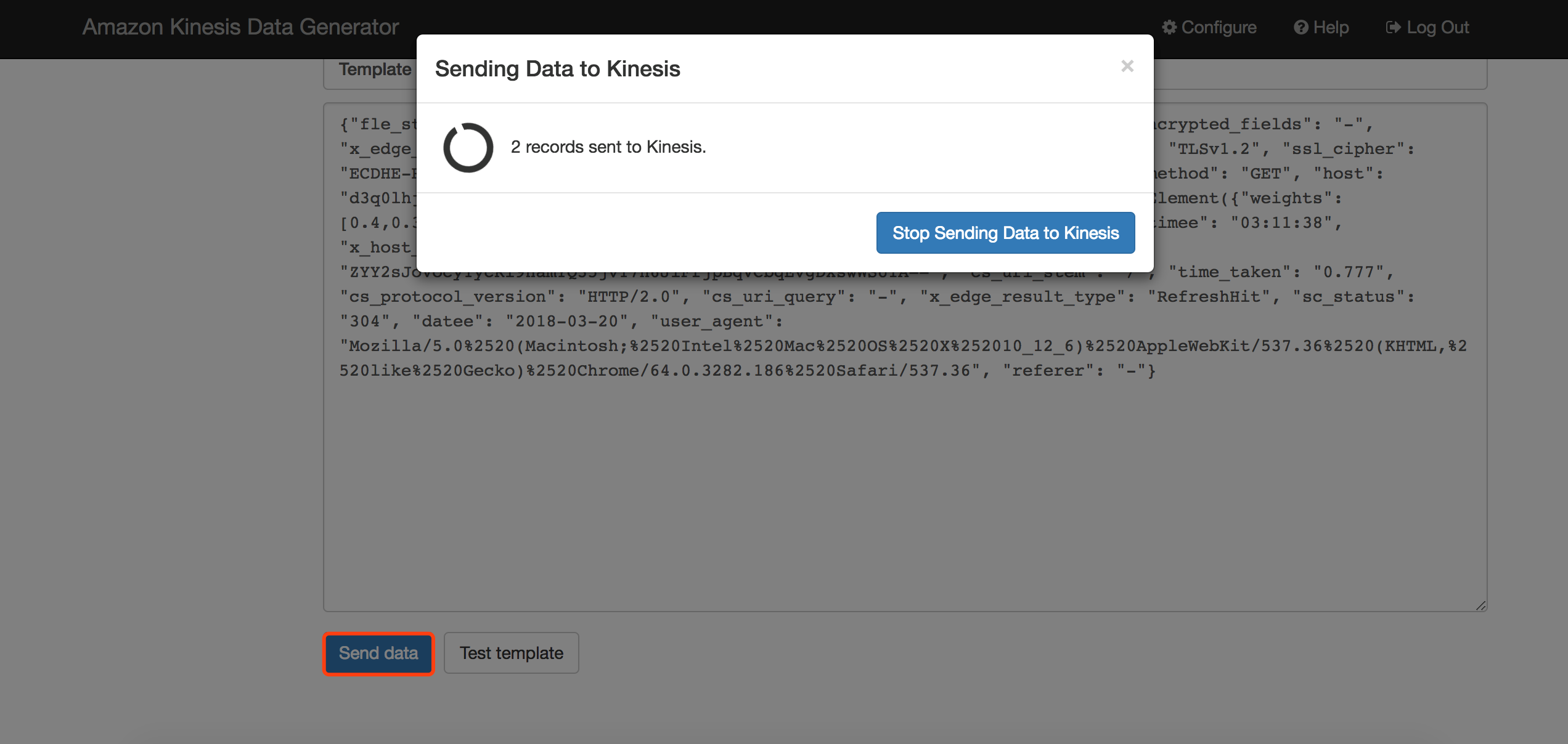 由于CloudFront需要有用户访问流量的情况下才会产生日志,并且产生日志的过程不是实时的,所以为了便于测试,我们通过一个工具模拟Lambda产生的消息打入Kinesis流中,大家可以从如下链接查看该工具的详情。https://github.com/awslabs/amazon-kinesis-data-generator