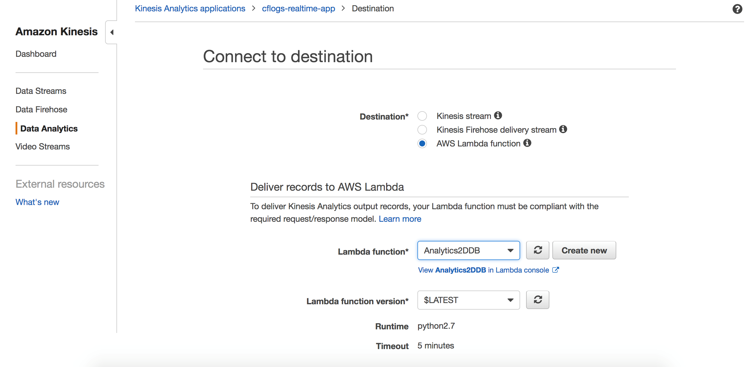 接着我们回到Kinesis Analytics界面,配置应用对接的输出。