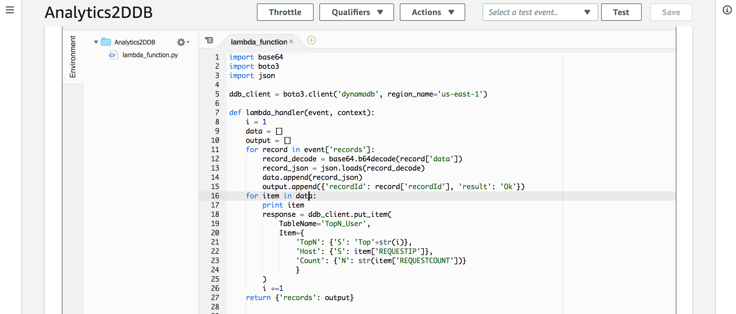 再继续配置Kinesis Analytics将分析结果输出之前,我们先来配置Lambda函数,用于接收输出结果,并将结果保存到DynamoDB中,Lambda代码可以从如下链接获取:
