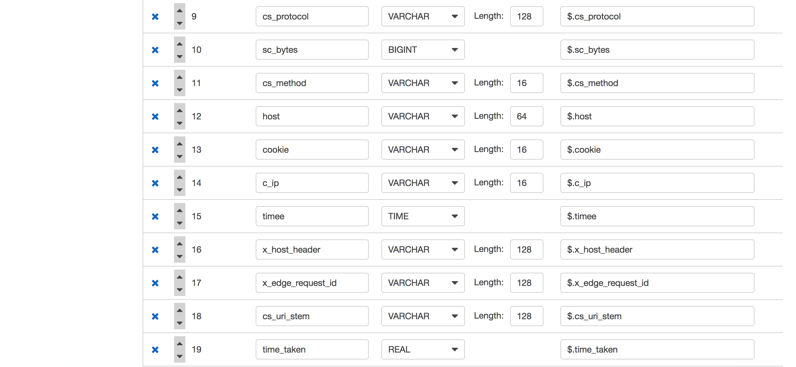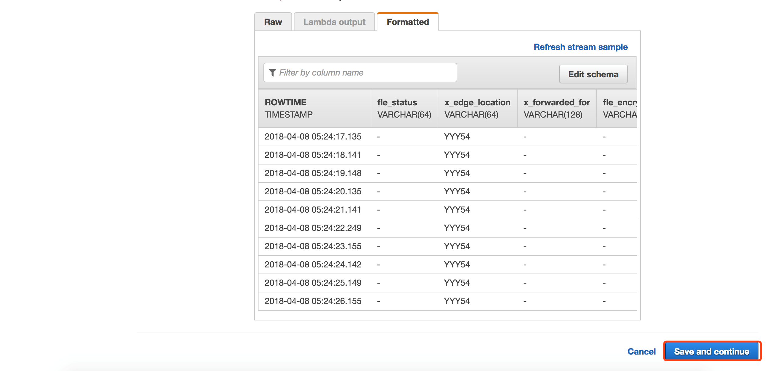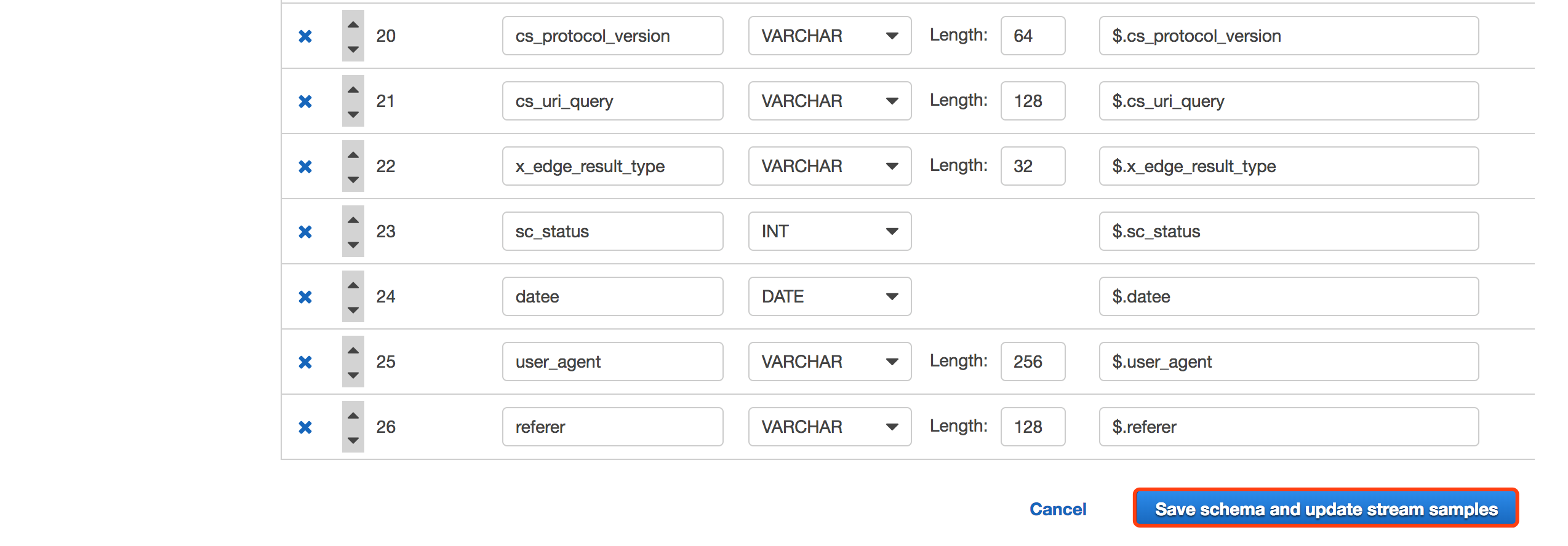 可以看到,Analytics可以自动帮我们识别JSON格式的CloudFront日志,但是由于我们打入的日志数据大部分数据为固定字段,所以自动识别的schema未必准确,比如:对于x_edge_request_id字段,varchar(64)可能过小,我们点击修改schema。