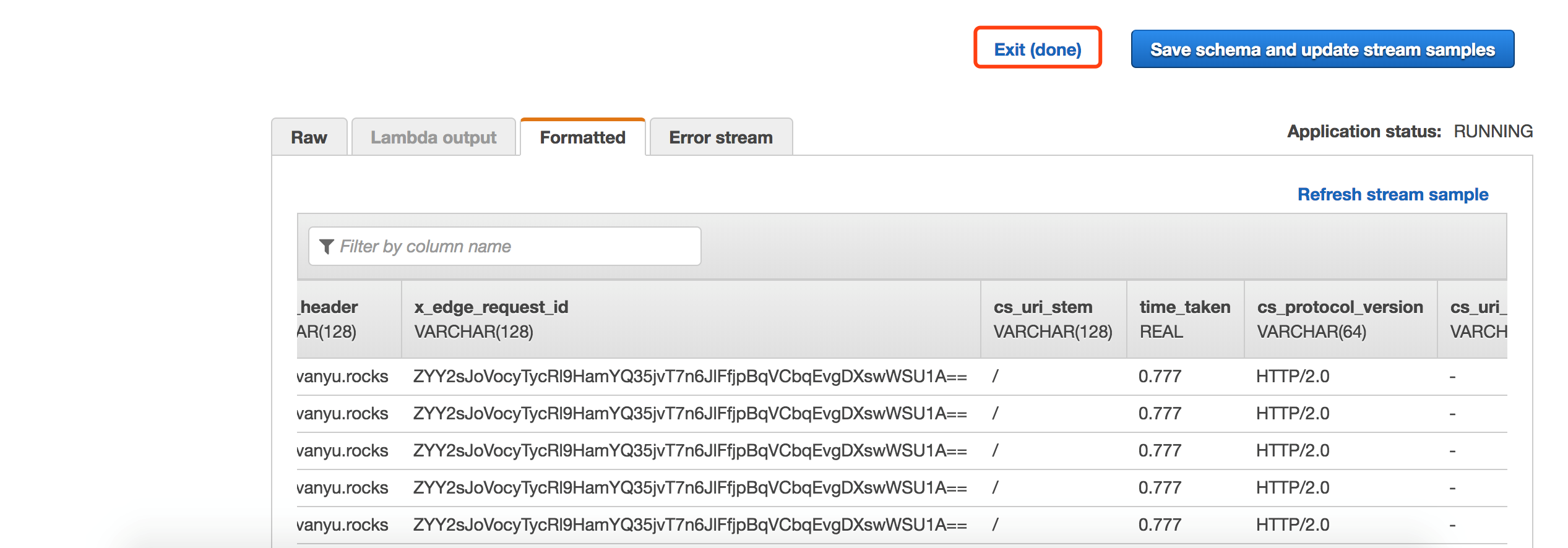 点击Save schema and update stream samples,查看各个字段类型及长度已经修改成功,点击Exit返回上一步。