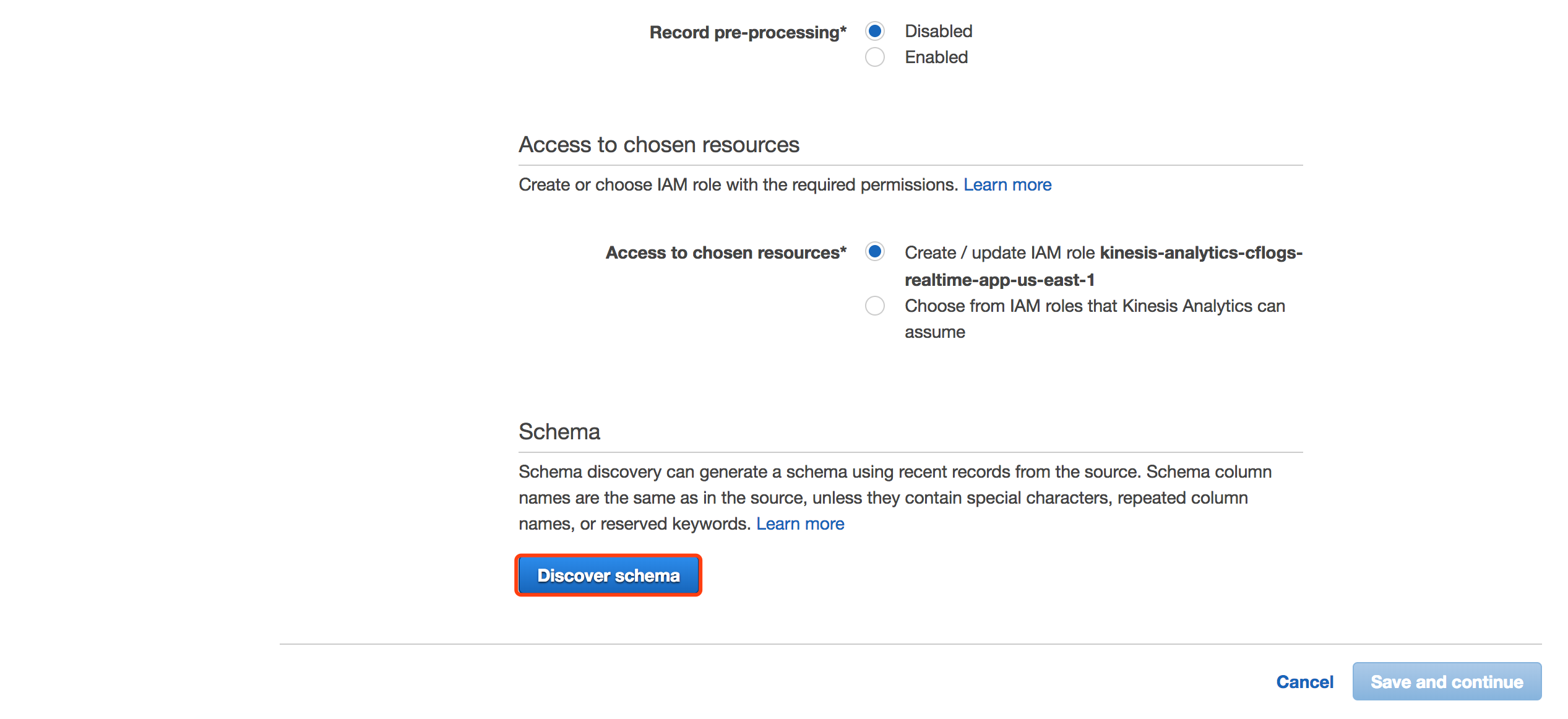 点击Discover schema,让Analytics自动发现Kinesis流中已有数据的schema。
