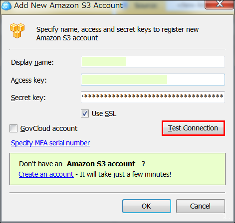 2.输入「Display Name」、「Access key」、「Secret key」以后,点击「Test Connection」。