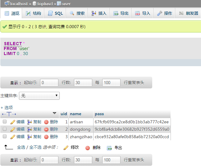 phpmyadmin2. 点击进入user数据库,可以看到下图所示。