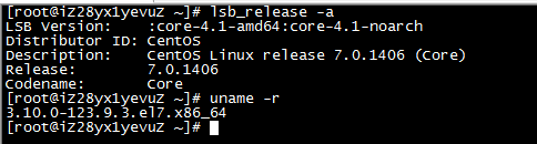 [root@iZ28yx1yevuZ ~]# lsb_release -a LSB Version: :core-4.1-amd64:core-4.1-noarch Distributor ID: CentOS Description: CentOS Linux release 7.0.1406 (Core) Release: 7.0.1406 Codename: Core [root@iZ28yx1yevuZ ~]# uname -r 3.10.0-123.9.3.el7.x86_64
