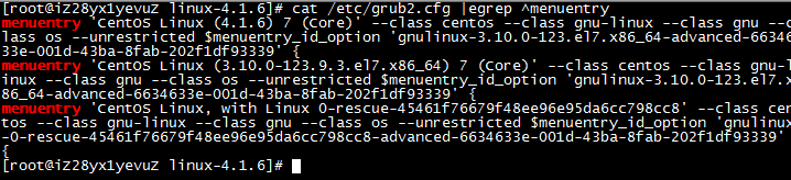 root@iZ28yx1yevuZ ~]#cat /etc/grub2.cfg |egrep ^menuentry