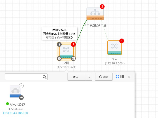 使用一台虚拟路由器,两台虚拟交换机用于连接内网局域网和外网机器所属的局域网,两台ECS: 一台纯内网,一台绑定了EIP作为NAT网关,如下: