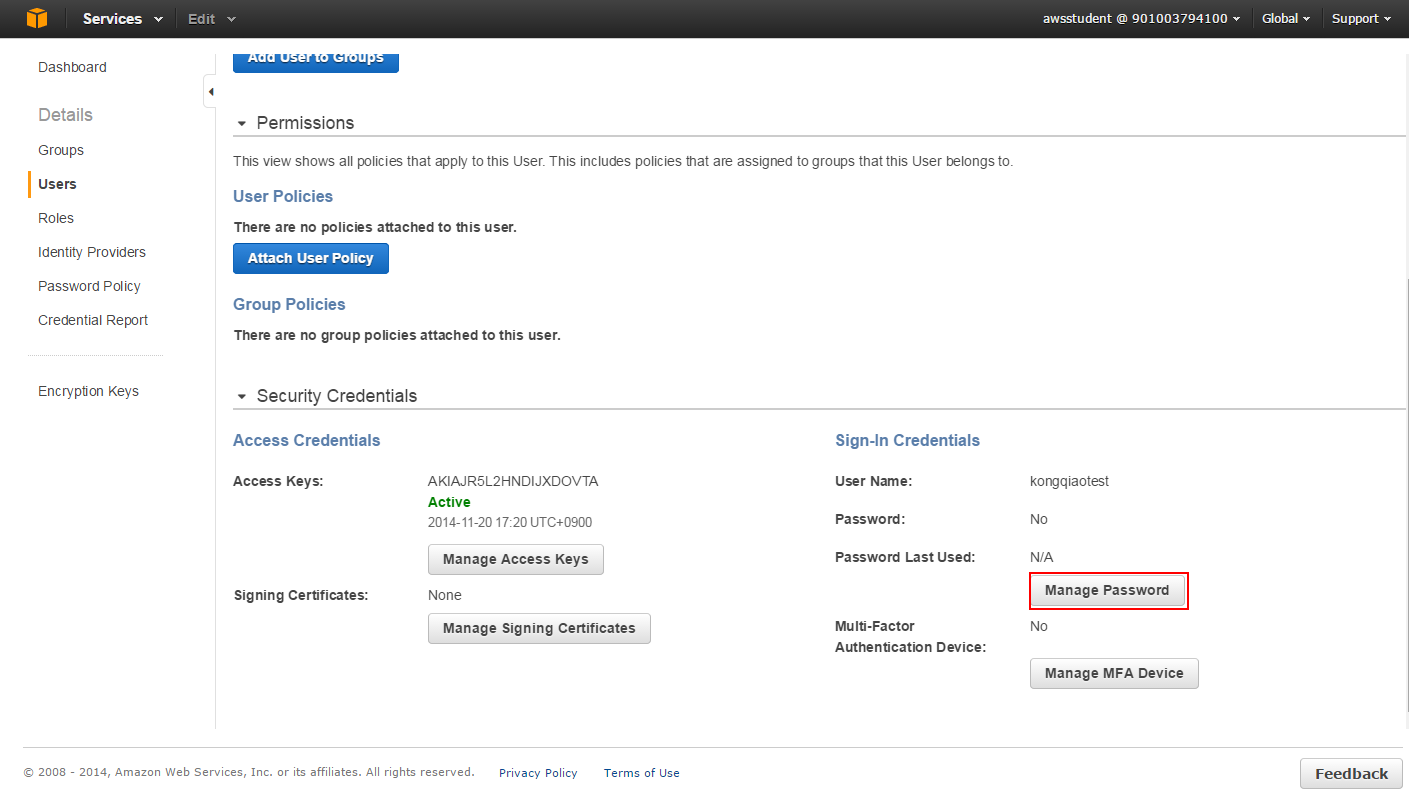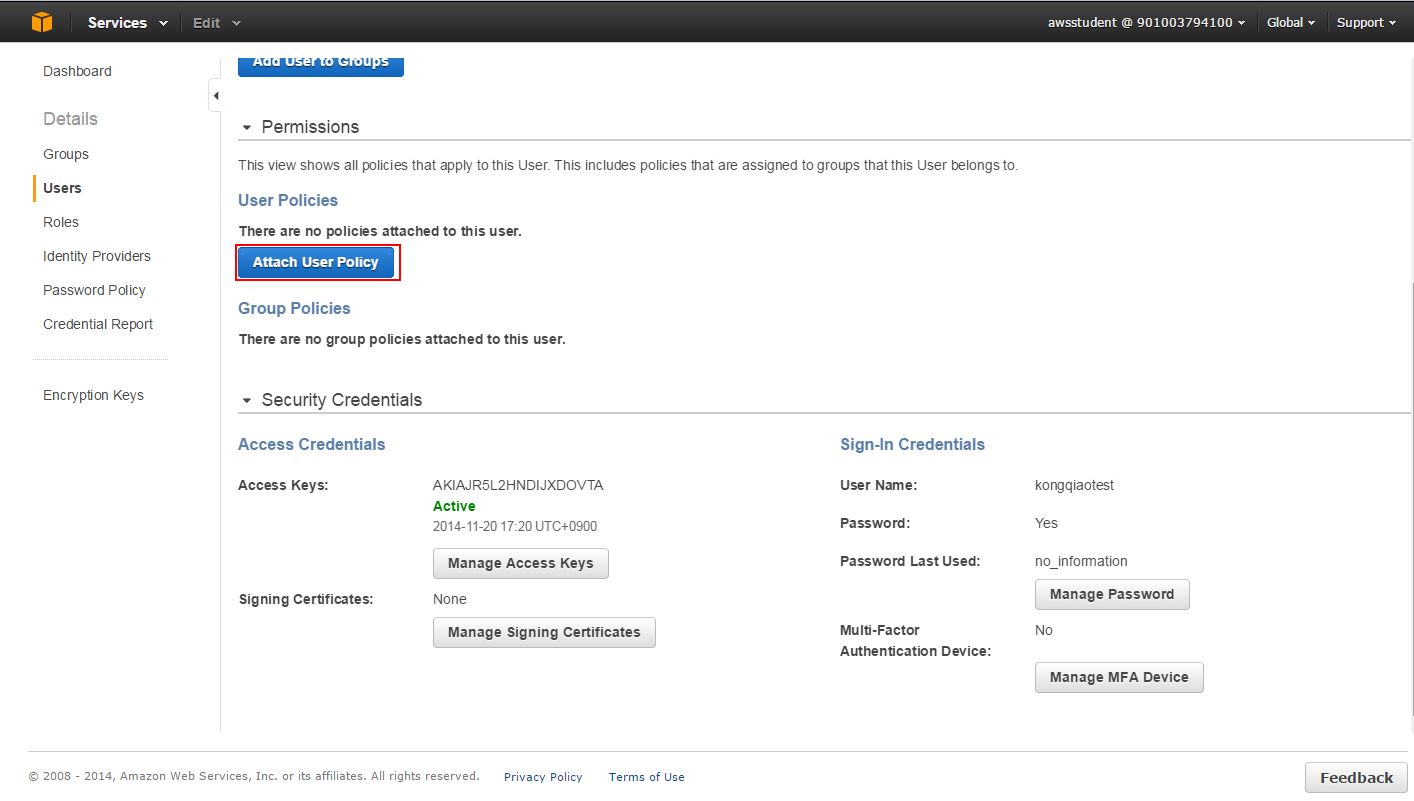 3.1从「permissions」所示画面,点击「Attach User Policy」。