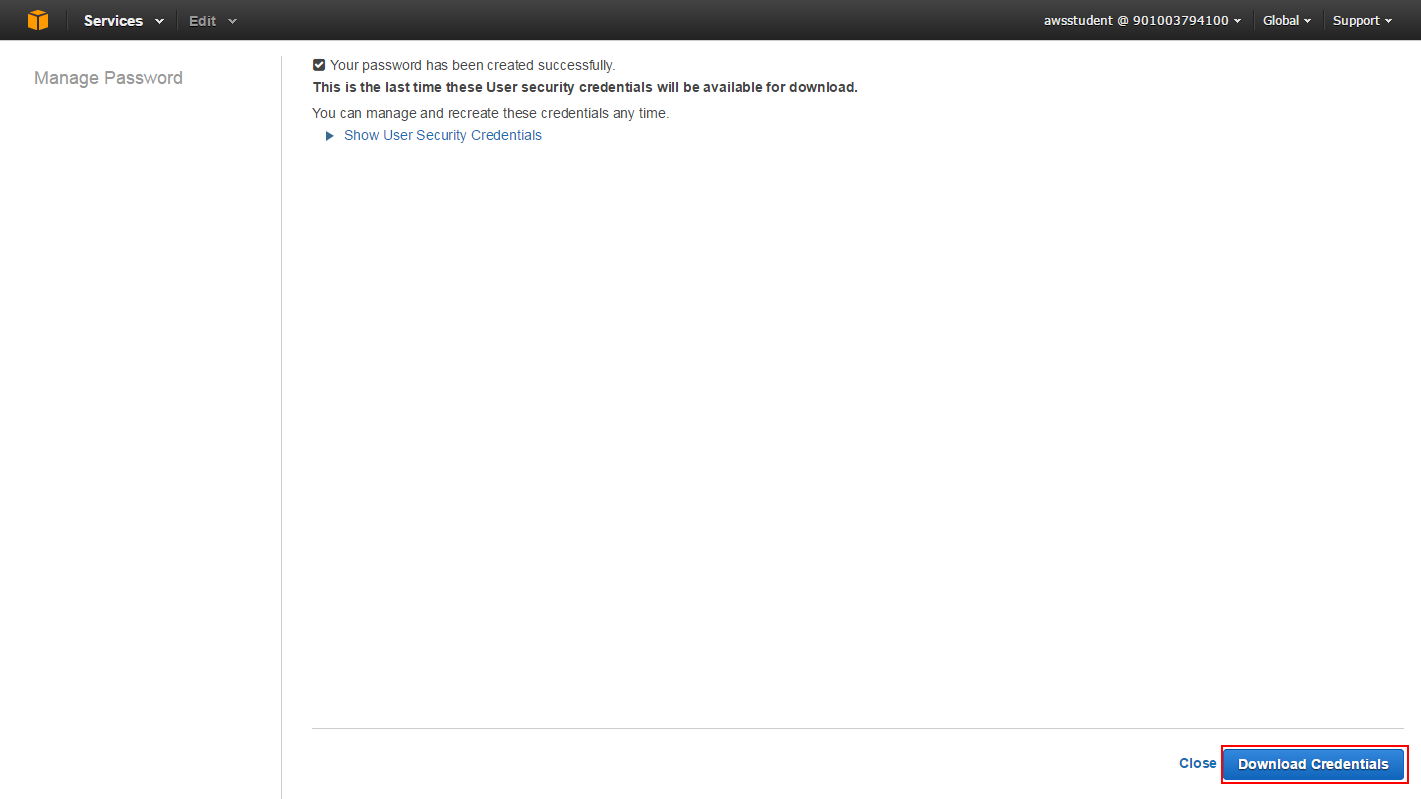 2.4如下密码创建成功,然后点击「Download Credentials」,下载Credential.csv文件。