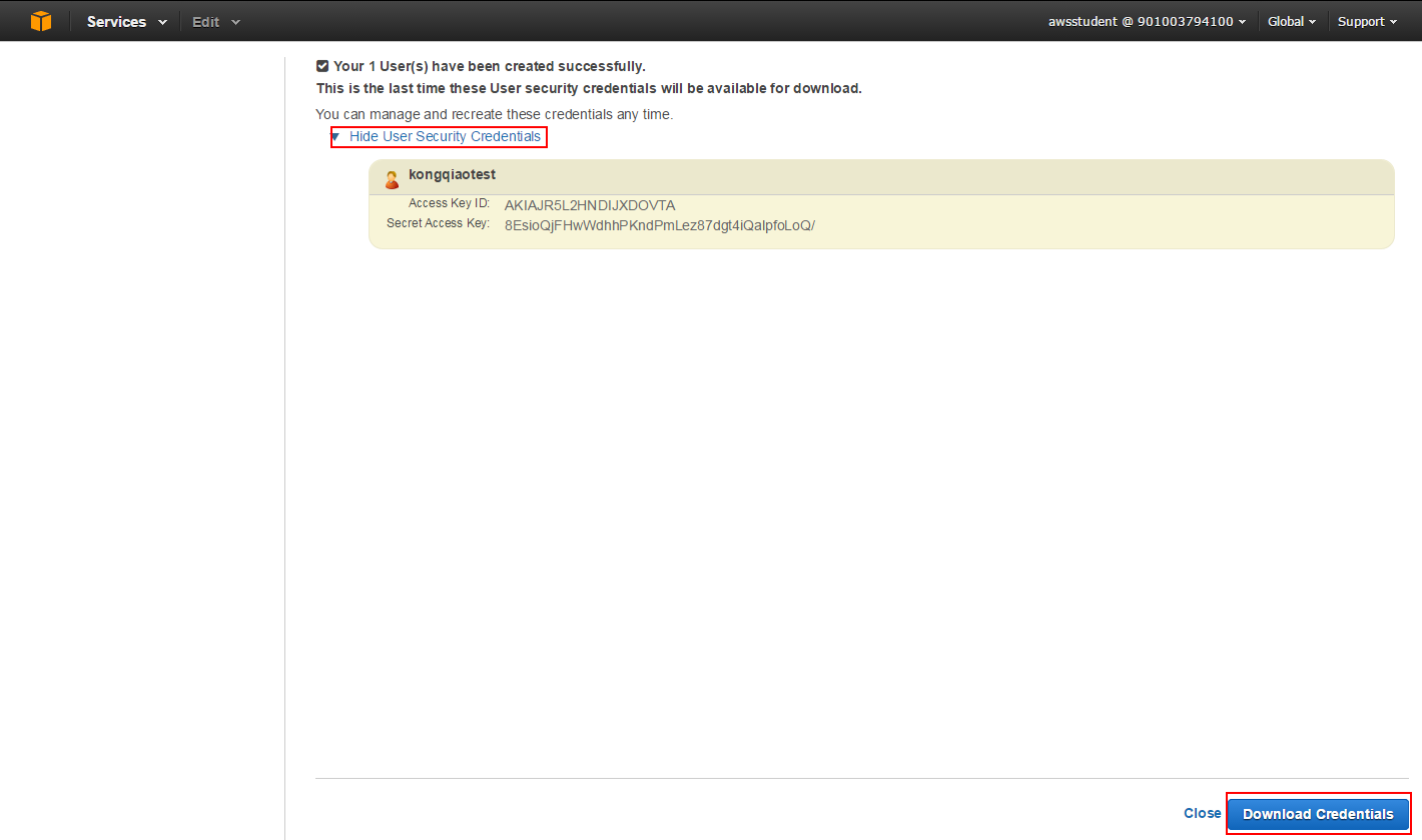1.4如下窗口显示用户创建成功。点击「Download Credentials」,然后点击「Close」关闭。Credential.csv里记载了用户名和使用API时的访问键和密钥。密钥仅在此次创建时取得,如果忘记下载,或者丢失,需要重新做成。