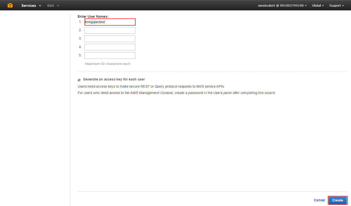 1.3如下对话框,可以同时做成5个用户,在最上面的空格里输入要创建的用户名,这里为「fuwuqi120test」。点击「Create」。