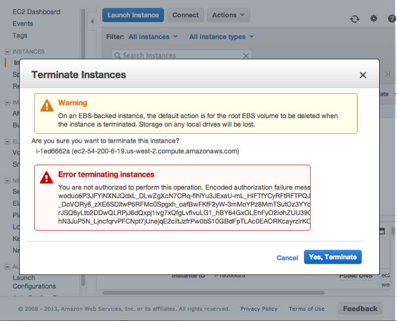 3.4实际登陆确认,登录后试着终止EC2实例。会显示如下错误信息。