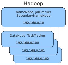 前3个程序一般是分别在三台不同的计算机里运行,为了简单起见下面的例子将在同一台计算机里运行这3个程序,然后再另外找3台计算机运行DataNode(连同TaskTracker),所以这个示例一共需要4台计算机。结构图如下: